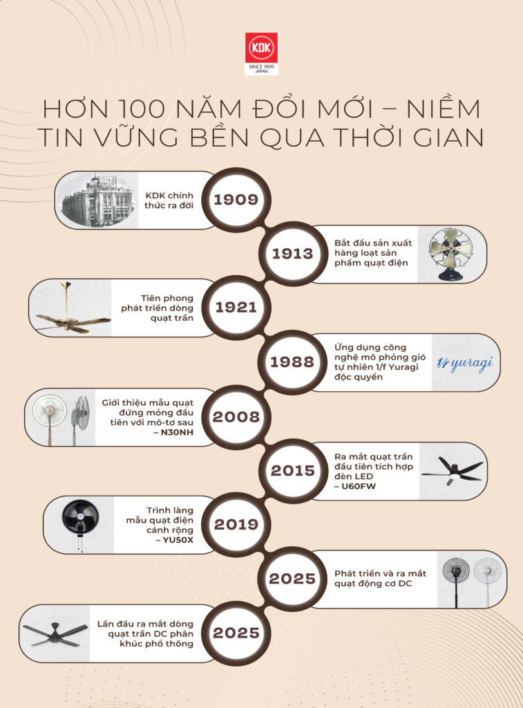 Mỗi dấu mốc là một bước chuyển mình từ chiếc quạt đầu tiên, công nghệ gió tự nhiên 1/f Yuragi, đến động cơ DC hiện đại của năm 2025.